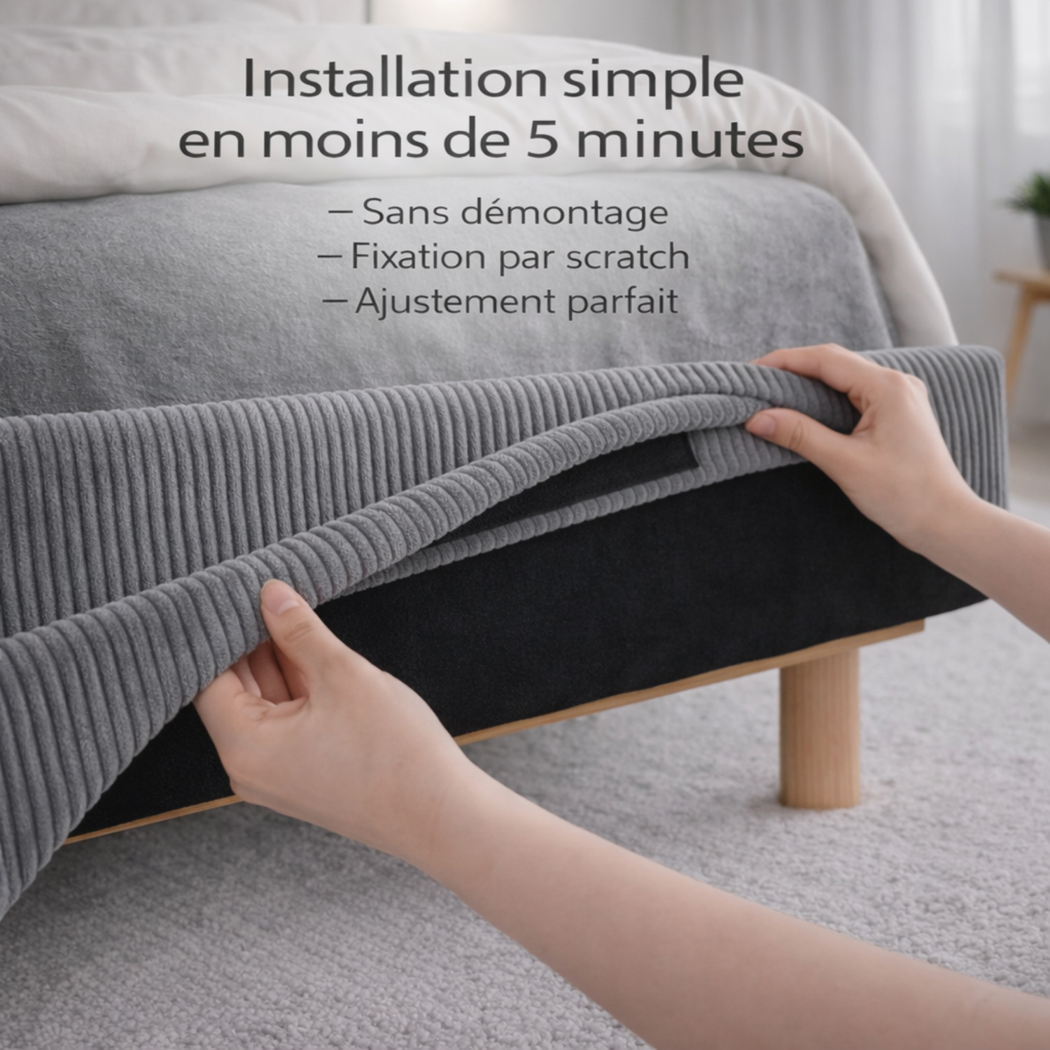 En moins de 5 minutes, votre lit change complètement de style. La housse épouse la structure pour un ajustement précis, sans plis ni affaissement, garantissant une finition propre et élégante.