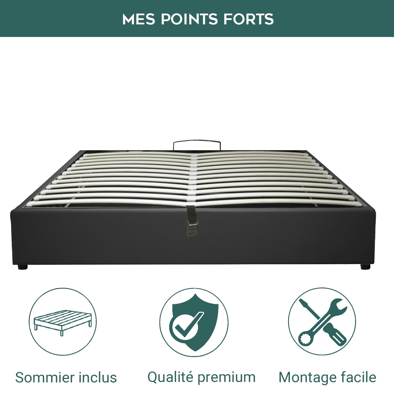 Profitez d’un espace de rangement XXL grâce à un coffre pouvant contenir jusqu’à 900 litres. Idéal pour y stocker couettes, oreillers, linge de lit ou affaires saisonnières, ce lit vous permet de gagner un maximum de place sans encombrer vos placards. Une solution aussi pratique qu’esthétique pour optimiser l’espace dans votre chambre.