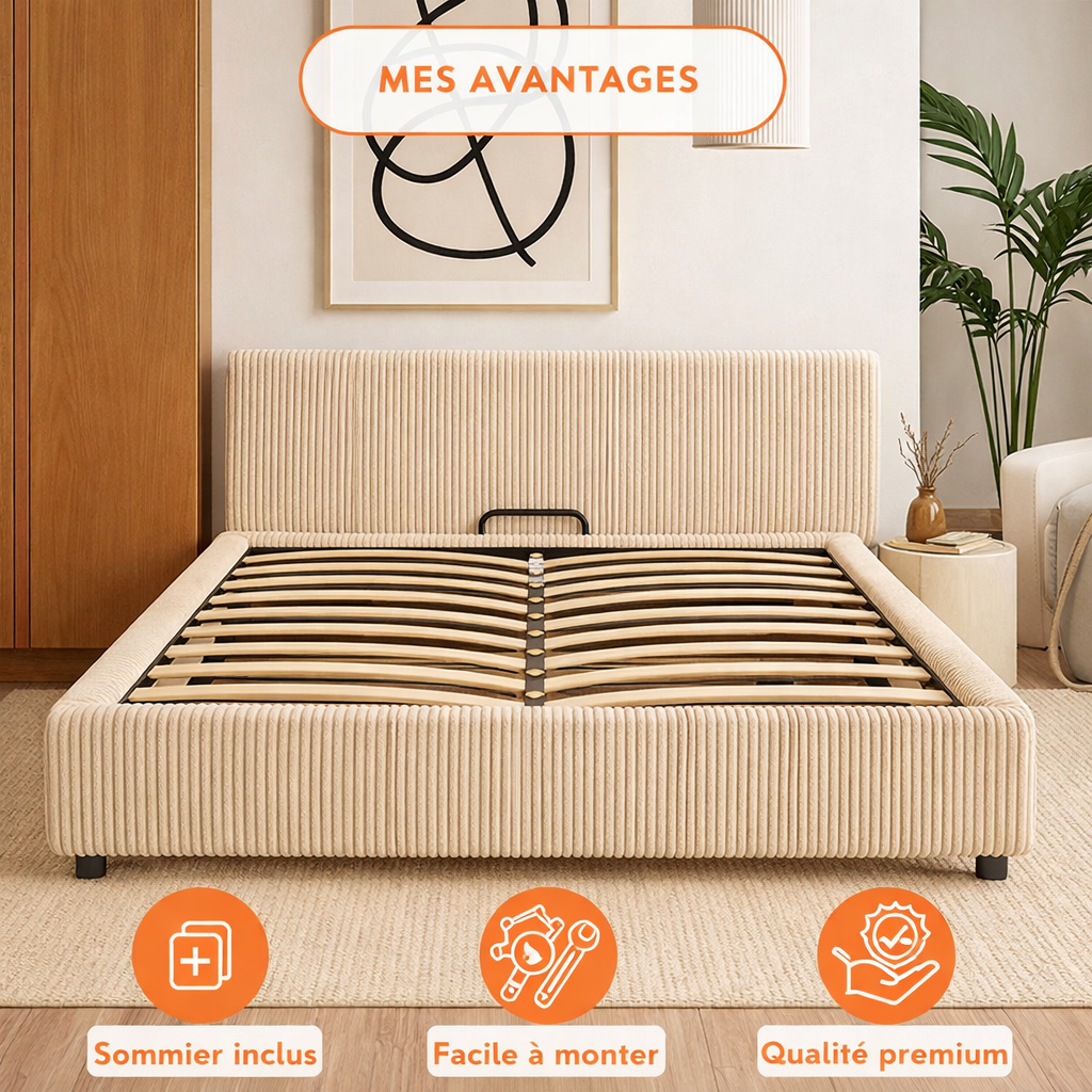 * Facilité d’utilisation : Grâce au système de levage assisté, le sommier se soulève sans effort, offrant un accès rapide et sans forcer.