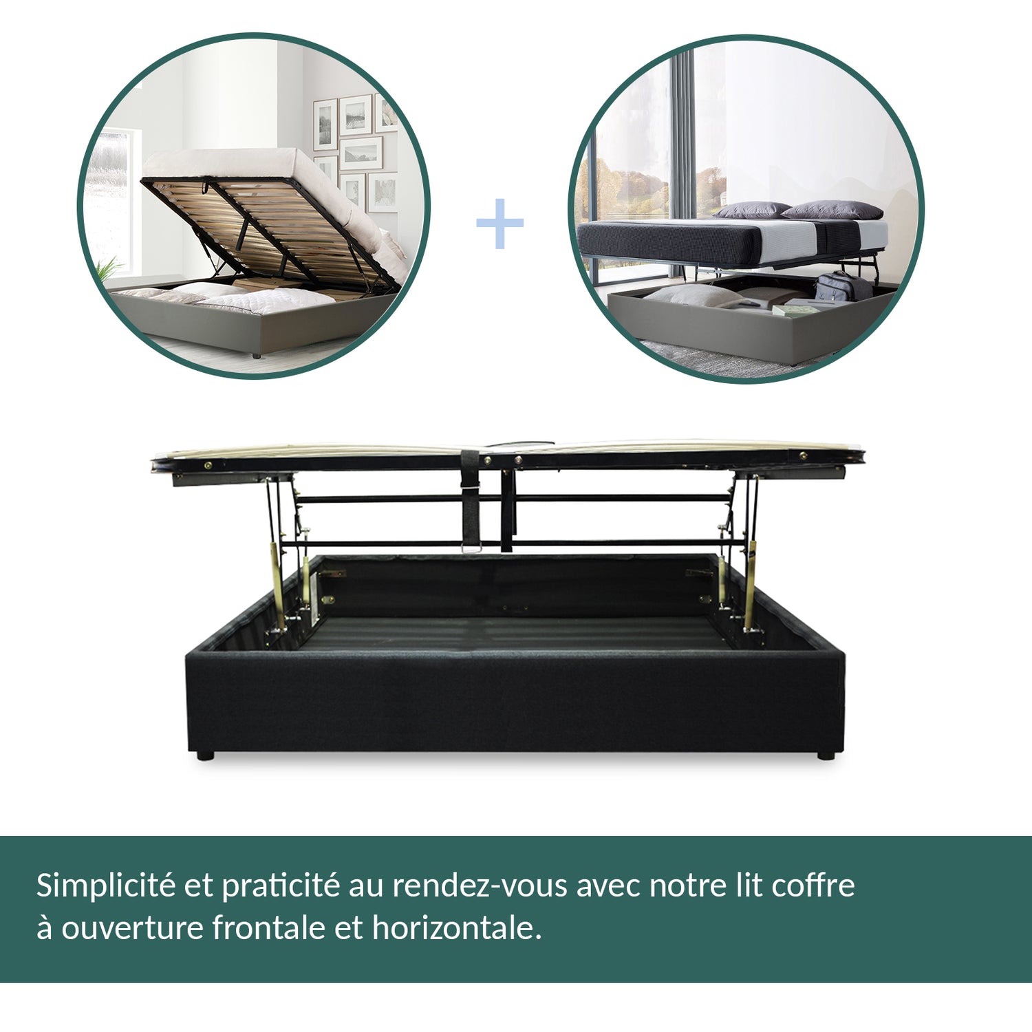 - Ouverture horizontale pratique : le sommier se relève parallèlement au sol, pour un accès total et sans effort au coffre de rangement.