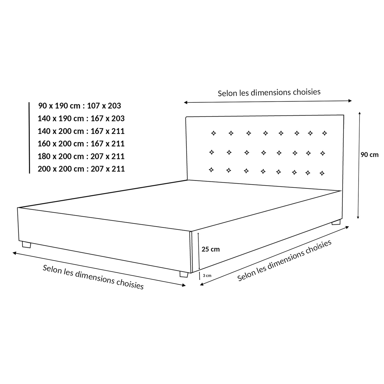 Informations sur les dimensions ci dessous, un débordement de 20cm au total de la tête de lit est prévu pour les tailles 90x190, 140x190, 180x200.