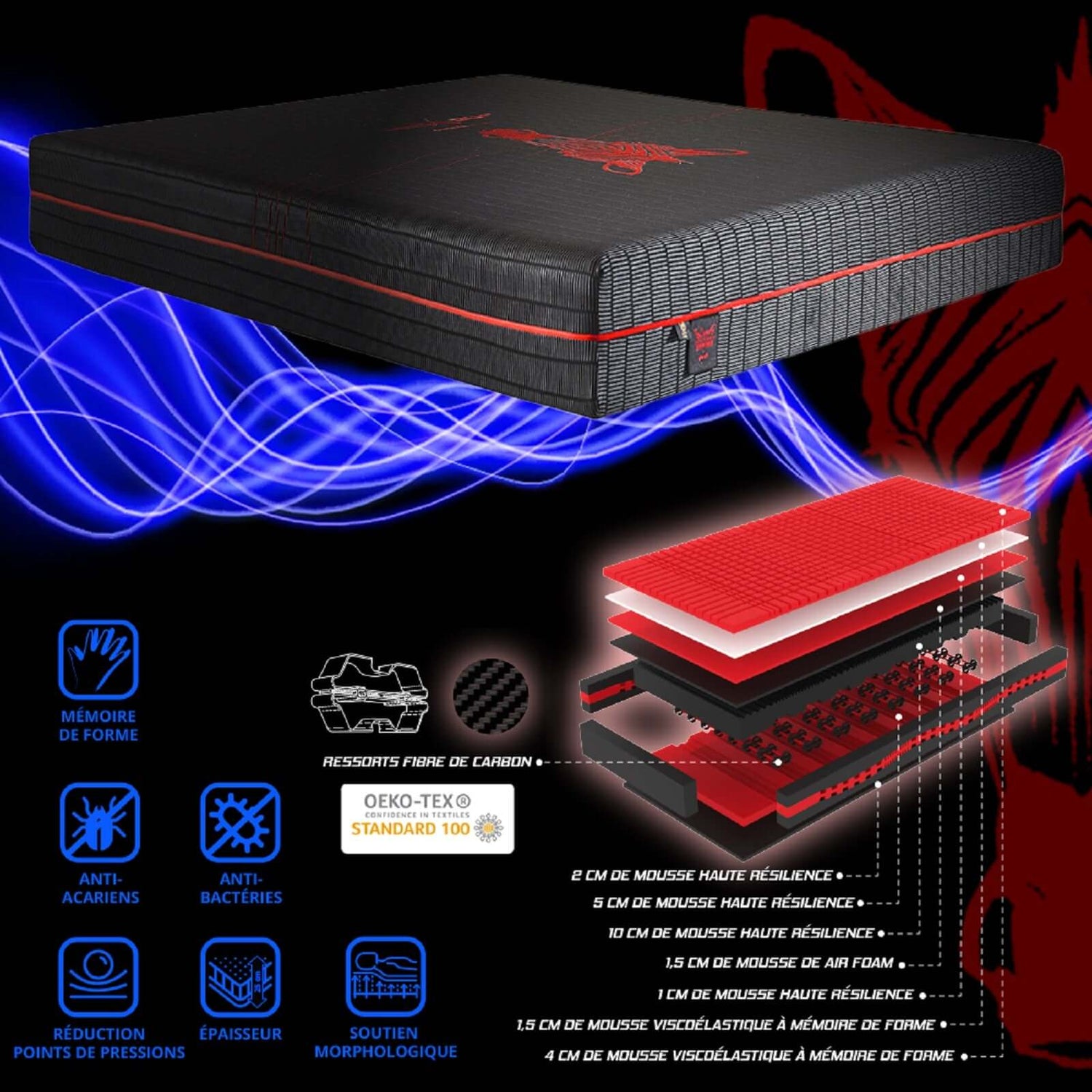 - Technologie du matelas : Ressorts en carbone, Mousse à mémoire de forme, Mousse AIR FOAM® et Mousse haute résilience HRS+