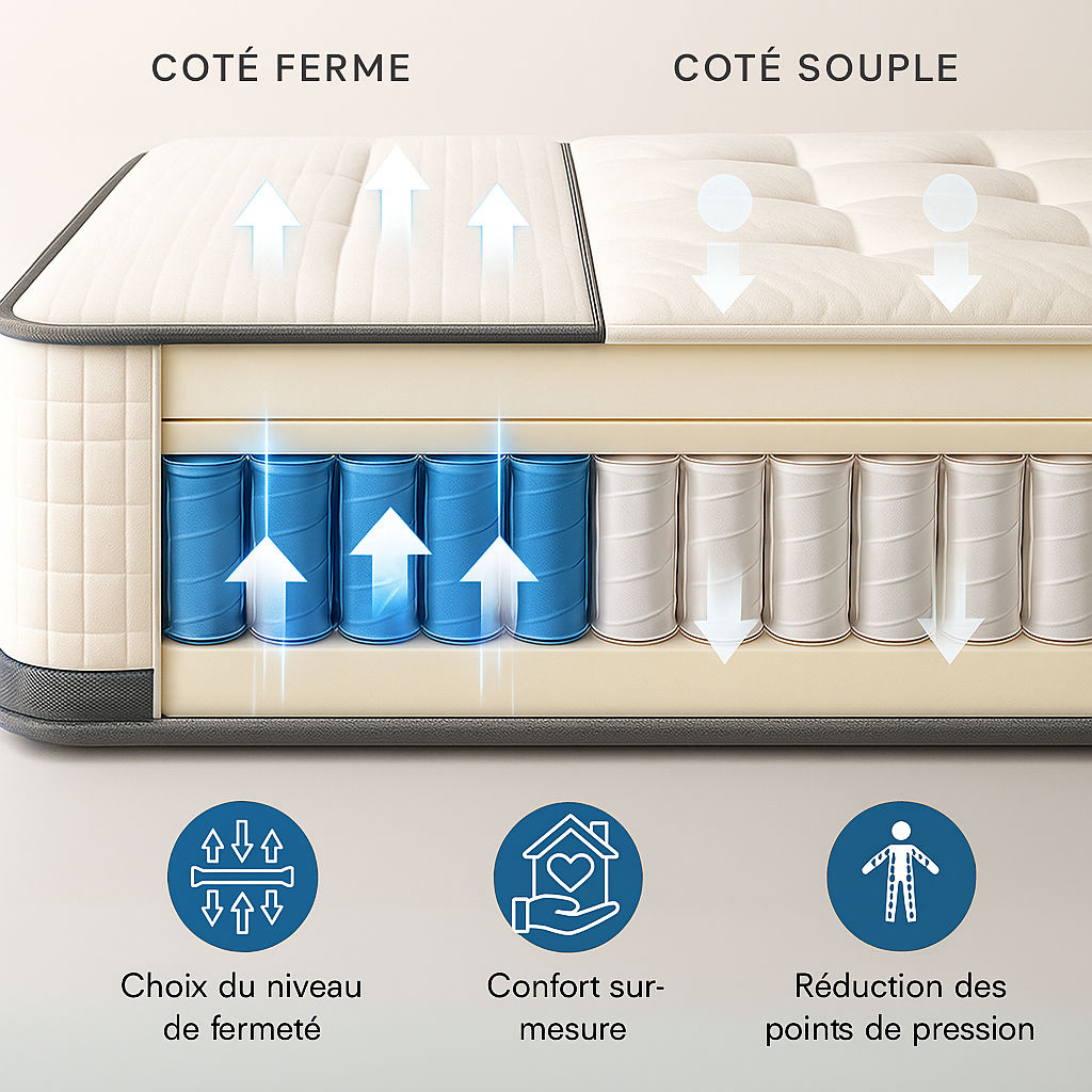 Matelas 2 conforts : Un côté ferme, un côté souple avec mémoire de forme