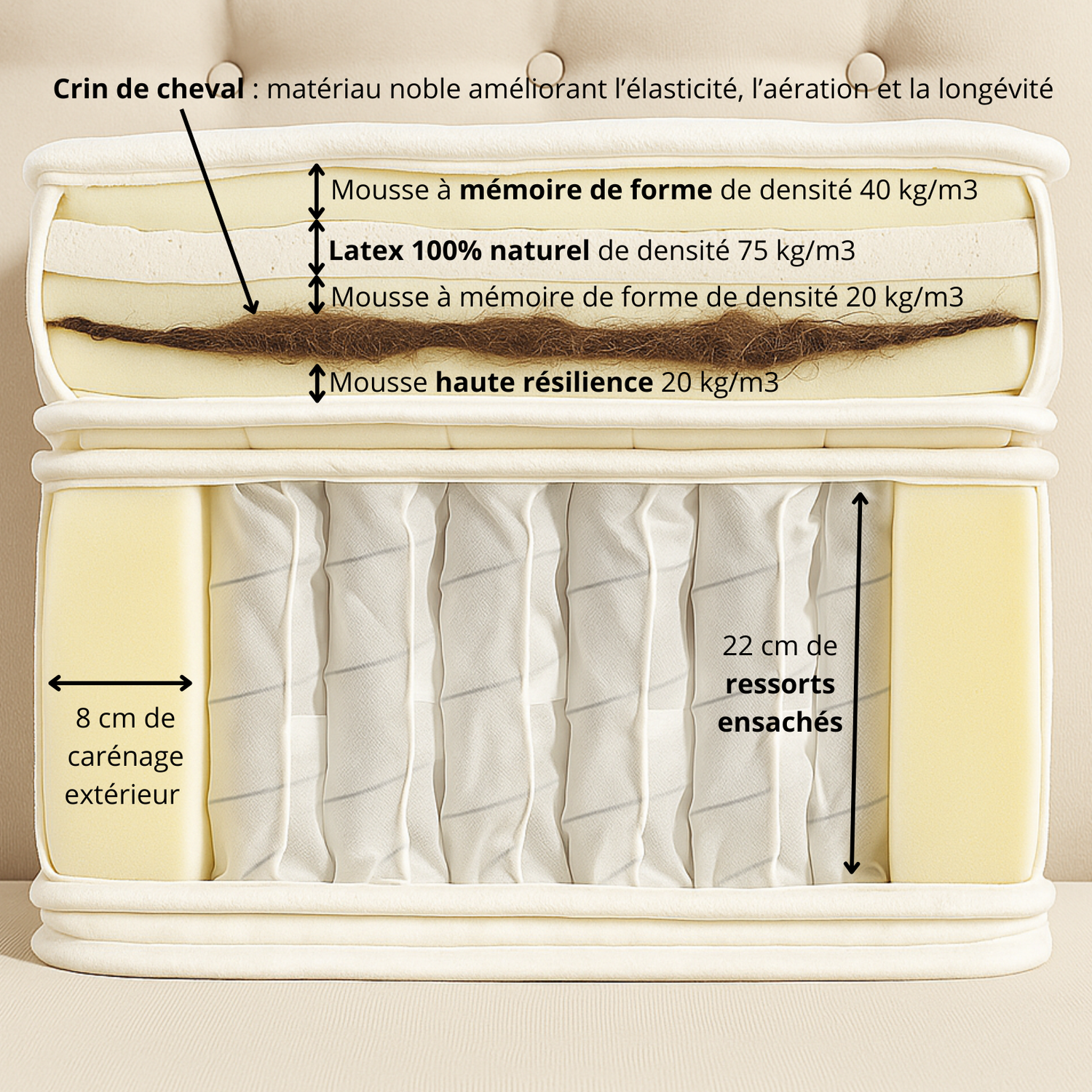 - Réduction significative des douleurs dorsales, lombaires et articulaires grâce à la combinaison du latex, du crin de cheval et de la mousse mémoire de forme, alliée aux ressorts ensachés.