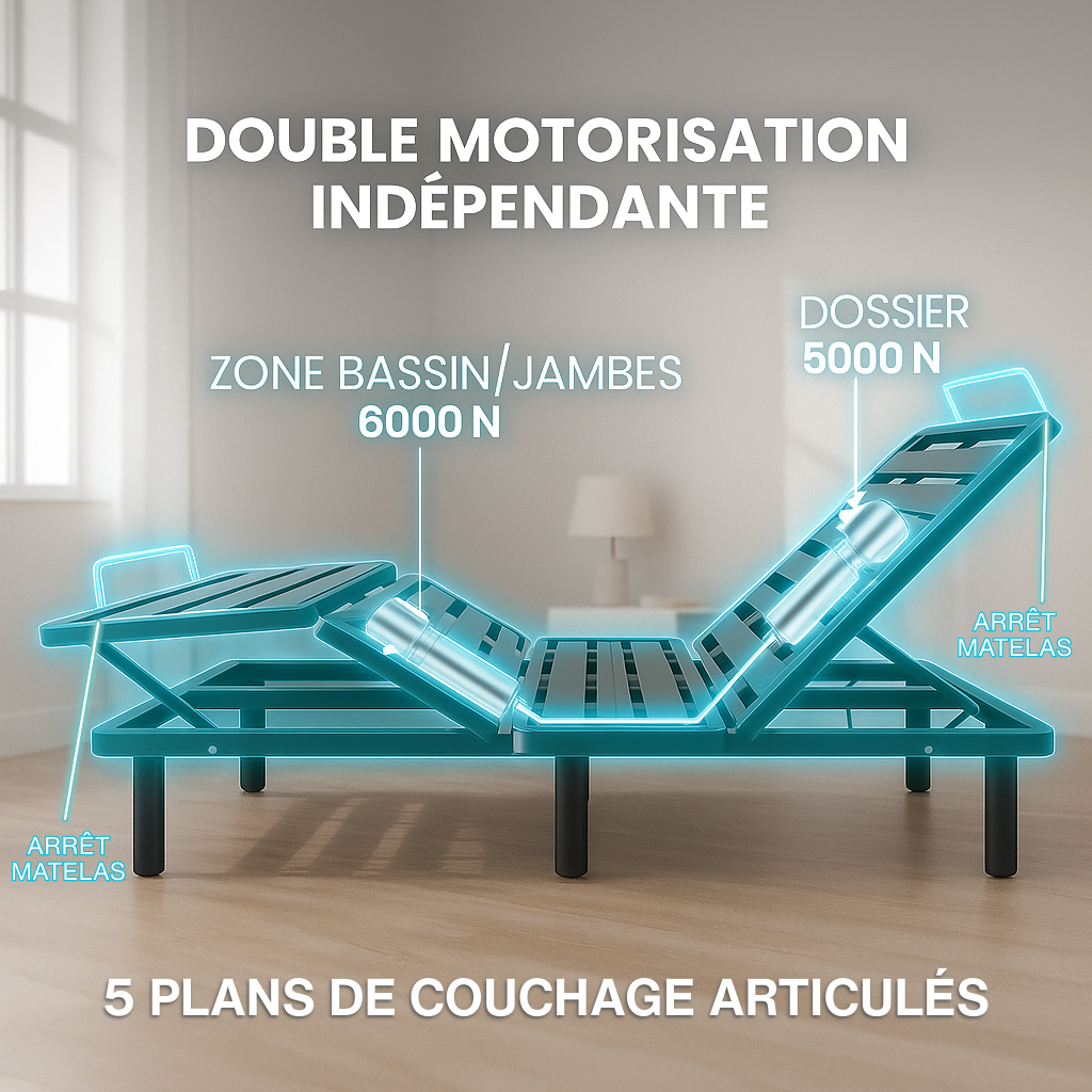 La double motorisation indépendante (5000 N pour le dossier et 6000 N pour la zone bassin/jambes) combinée aux 4 plans de couchage articulés offre un confort totalement personnalisable. Chaque utilisateur peut ajuster le sommier au millimètre près pour soulager les points de pression, trouver la position la plus adaptée à ses habitudes et améliorer la qualité de son sommeil. L'utilisateur a également la possibilité de mémoriser sa position de couchage favorite. Cette technologie est idéale aussi bien pour se relaxer en lecture, regarder la télévision ou tout simplement profiter d’un repos profond et réparateur. Elle apporte également des bienfaits physiologiques notables, comme l’amélioration de la circulation sanguine ou le maintien optimal de la colonne vertébrale.